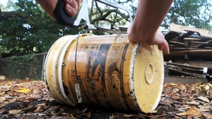 Приставьте шаблон к боковине ведра и нарисуйте круг. Расстояние от днища около десяти сантиметров.