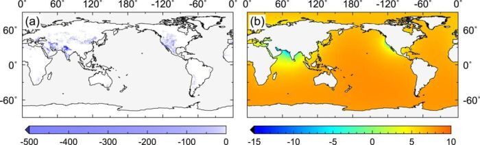 Общее изменение запасов подземных вод на суше (a) и связанное с ним изменение уровня моря (b) за 1993–2010 год / © Geophysical Research Letters