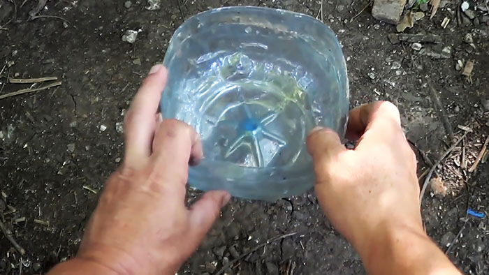 Отрежьте верхнюю часть пластиковой бутыли, сделайте открытую емкость объемом примерно один литр.