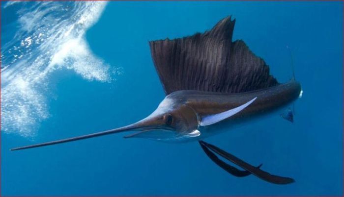 Парусник оставил позади всех конкурентов в воде. Скорость парусника – 112 км/ч. И это не единственное достоинство. Он может резко менять направление или мгновенно застывать на месте. Спинной плавник рыба использует только при резких поворотах при стремительном движении. При спокойном плавании плавник складывается и почти незаметен.