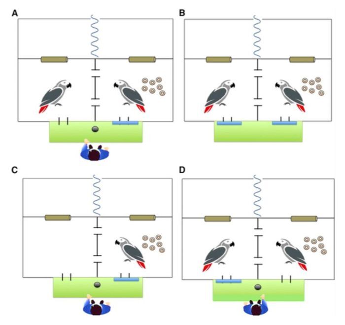 Исследовательская группа разработала тест на альтруизм и опробовала его на двух разных видах попугаев — восьми серых попугаях и шести горных арах (primolius couloni). Птиц предварительно обучили обменивать жетоны на угощения. Затем «добровольцев» поместили в прозрачный корпус с перегородкой между ними. В передней части коробки были отверстия, через которые можно было взаимодействовать предметами с человеком, а разделительная стена между птицами имела отверстие, через которое они могли обмениваться между собой.