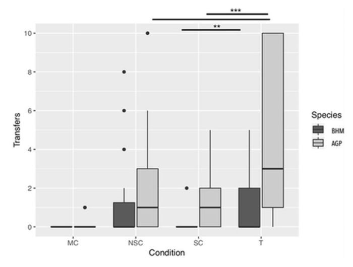 Концепцию обмена поняли как серые попугаи, так и горные ара. Но когда одной из двух птиц давали жетоны, только серые попугаи, а не ара, сознательно передавали предметы своим друзьям, чтобы они получили пищу. Семь из восьми серых попугаев предоставили своему партнеру жетоны: всего они подарили сородичам 157 из 320 «монет». Преимущественно тем, с кем они имели более прочные связи.