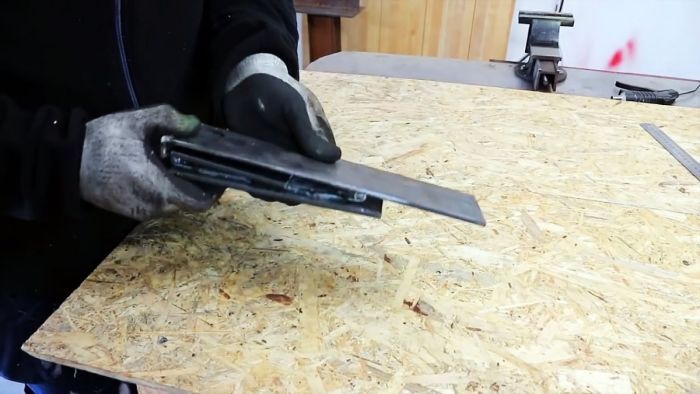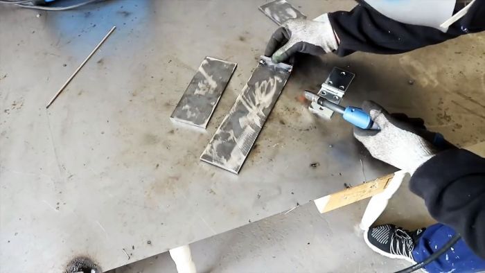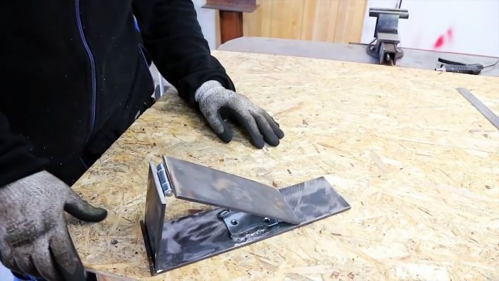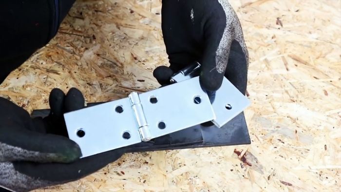 Поперечная линия соприкосновения 20-сантиметровой полосы и основания будет местом расположения оси вращения петли. Прихватываем сваркой одну ее половину к основанию, а другую – к 20-сантиметровой полосе.