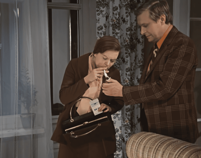 Секретарше Верочке он подарил целый блок американских сигареты "Marlboro". На момент съемок фильма, а это 1977 год, такой стоил ....*