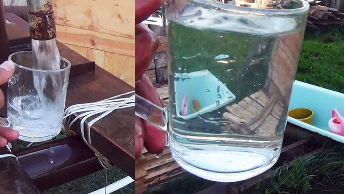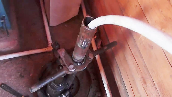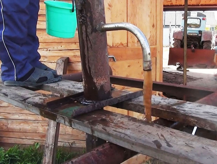 По достижении необходимой глубины проверьте наличие воды: опустите в нее на нитке гайку. Есть вода – отлично, вставьте в трубу пластиковый шланг и подключите его к колонке для воды с ручным насосом.