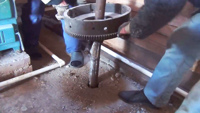 Потребуется толстостенная труба диаметром 50 мм и длиной примерно 7–6 м. Технология пробивки предусматривает сварочные и сверлильные работы – подготовьте аппарат, сверлильный станок или дрель. Забивать надо тяжелым грузом, в нашем случае используется маховик от дизельного двигателя СМД-14. К трубе прикручивается подвижный прочный металлический держатель.