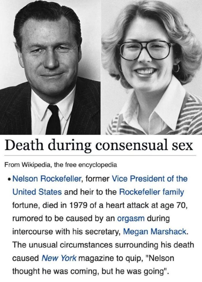 Смерть в результате секса по обоюдному согласию — явление редкое и необычное, но в истории известны случаи, когда люди уходили из жизни именно в такие моменты. Одним из самых известных примеров является смерть Нельсона Рокфеллера, бывшего вице-президента США и наследника состояния семьи Рокфеллеров.
