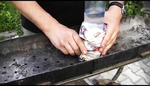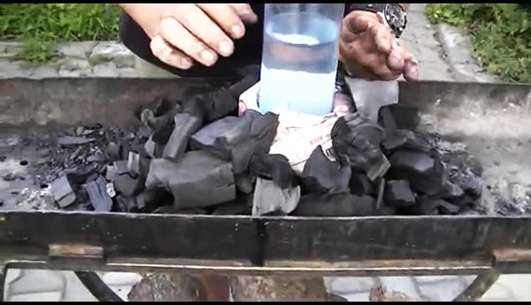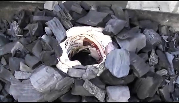 Засыпаем полностью, чтобы этот своеобразный колодец был скрыт с боков надежно углем. И аккуратно вынимаем бутылку.