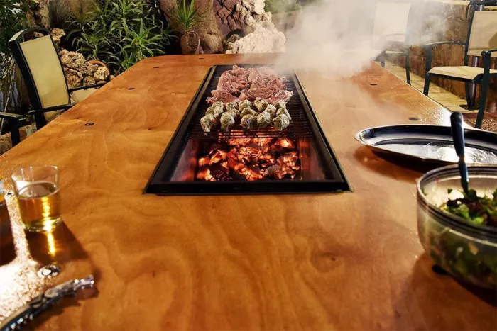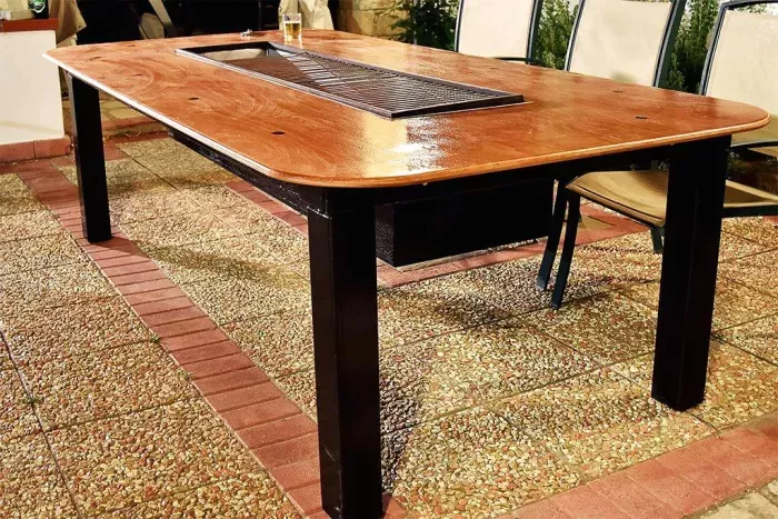 Стол, о котором мы сегодня хотим рассказать, представляет собой комфортное сочетание барбекю и обеденного стола для большой компании. В его середине вмонтирована жаровня, на которой каждый может себе приготовить то, что ему нравится. Такое новшество не оставит равнодушным даже самых привередливых в еде гурманов и вегетарианцев.