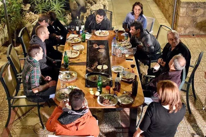 Стол готов, остается лишь заполнить короб для барбекю горящими углями, выставить на него решетки, еду, и насладиться живым общением в дружной компании.