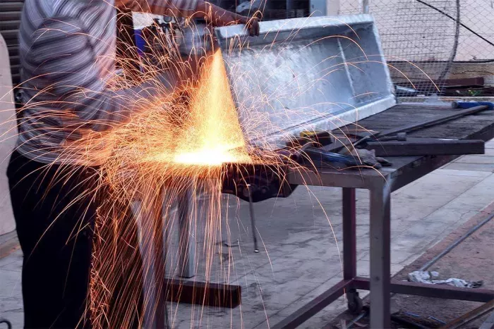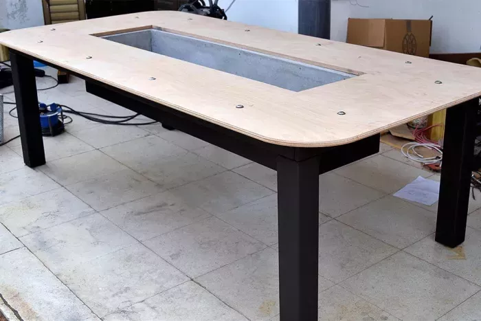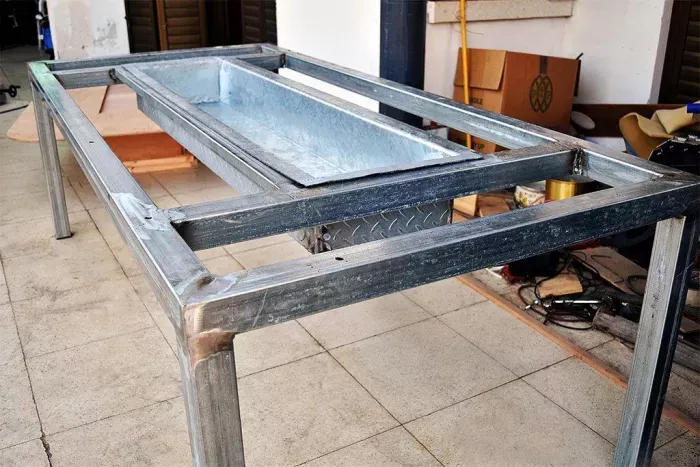 Определившись с размерами лотка, выбираем середину столешницы под него электрофрезером. Емкость для углей делаем из листовой стали в форме короба с открытым верхом. Отдельные элементы можно вырезать сваркой или отрезным кругом УШМ.