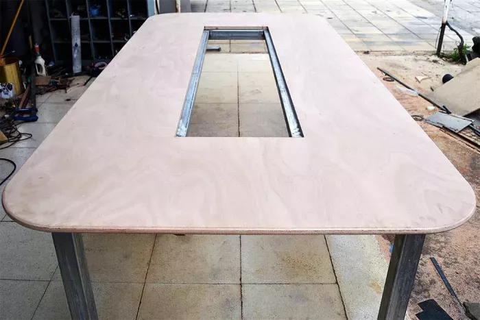 Теперь можно поместить сверху лист фанеры, и превратить его в столешницу. Для этого отрезаем его по размеру стола, электрофрезером закругляем концы листа, а полукруглой фрезой срабатываем наружную кромку по всему периметру заготовки. Настала очередь примерить пластиковые заглушки на торцы ножек.