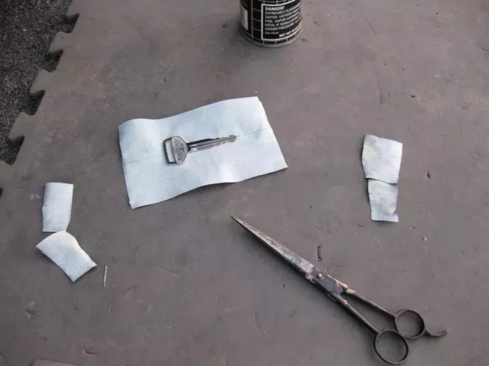 Далее отрезаем кусок металлизированного скотча таким образом, чтобы его длина была на 4-5 см больше, чем ключ, и размещаем его посредине со стороны с клейким слоем.