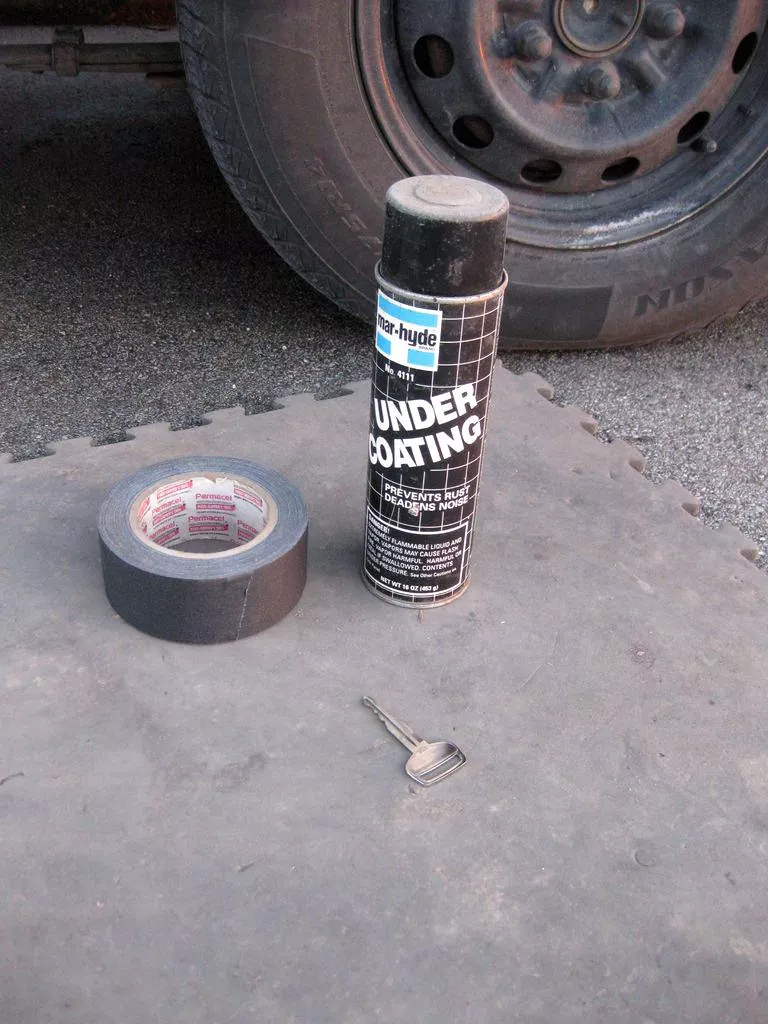 Распыляем мастику на участок с приклеенным ключом, захватывая и необработанные поверхности днища. После можно проехаться по пыльной дороге (грунтовке) и повторить процедуру еще раз. Уже после второй обработки очертания ключа станут еле заметны, а осевшая впоследствии пыль (грязь) полностью завуалирует секретный тайник. Водонепроницаемый скотч и слой мастики надежно запечатают ключ и защитят его от воздействия окружающей среды, так что, когда он вам понадобится, он будет как новый.