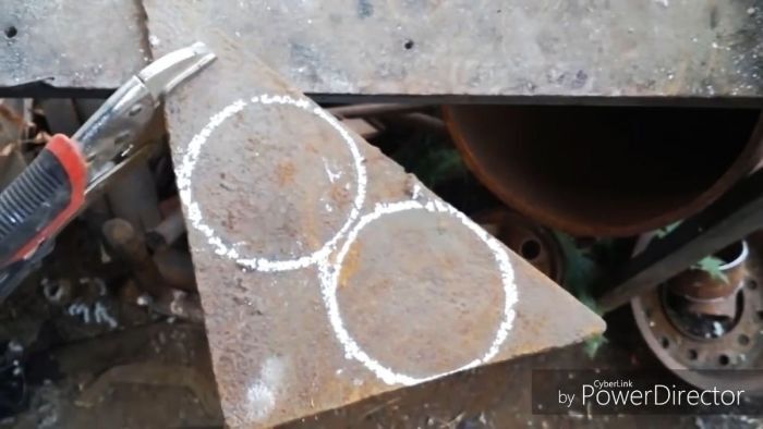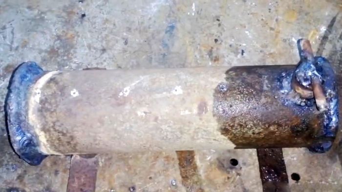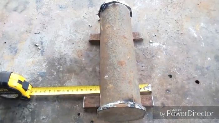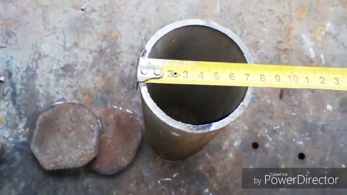 Для начала нужно отрезать трубу по длине топки. В идеале, чтобы она была равна обычно используемым дровам. Из толстого листового металла вырезаются 2 круга d72 мм и привариваются на торцах трубы.