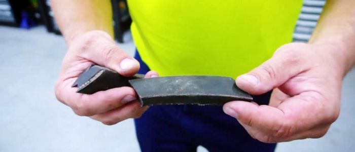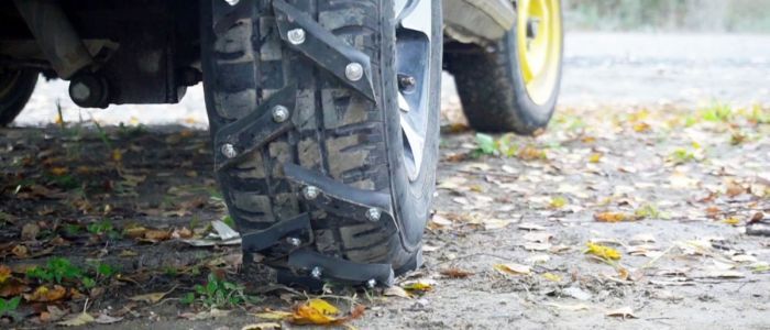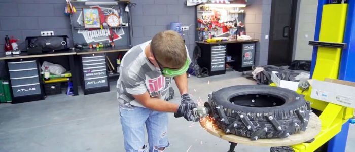 Топором на ровной доске нарубите заготовки ремня. Длина примерно 15 см, конкретные значения зависят от ширины покрышки и угла наклона отрезков. Лезвие топора располагайте под углом 45 градусов к оси ремня. Количество зависит от расстояния между отдельными элементами, в среднем оно должно составлять 20 см.
