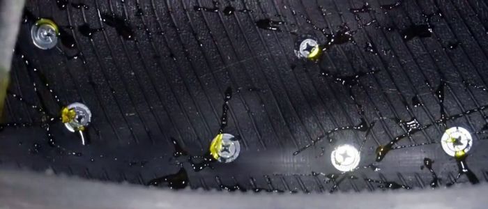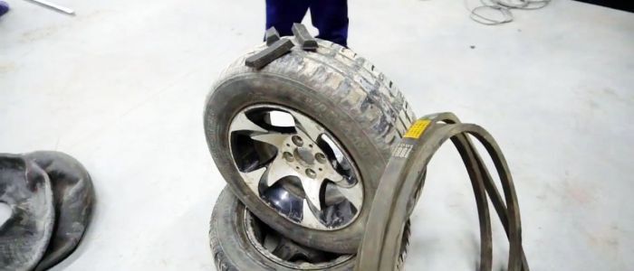 По описанному алгоритму установите «елочку» по всему колесу. Подготовьте две покрышки на задние колеса. Старую камеру разрежьте по радиусу. Надо сделать подобие флиппера – это специальная лента, защищающая камеру от повреждения шляпками болтиков, которые держат по периметру покрышки куски ремня. Намажьте внутреннюю сторону покрышки резиновым клеем.
