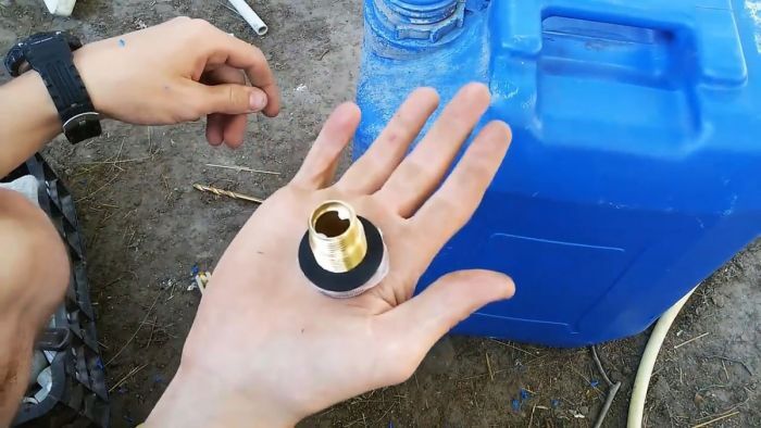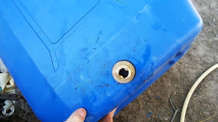 Купите врезку необходимых размеров, определитесь с местом ее установки на канистре. В большинстве случаев это нижняя ровная часть у днища емкости.
