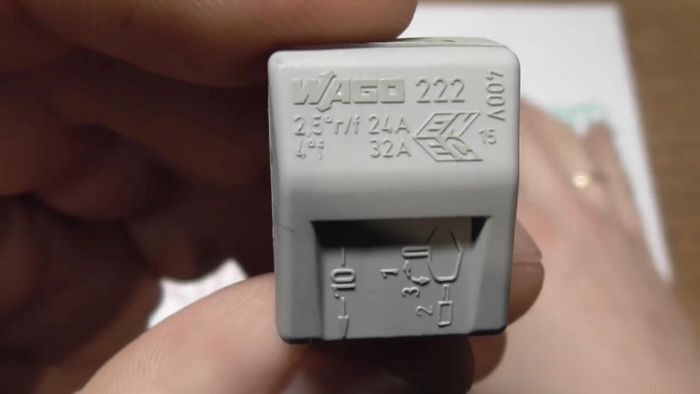 Wago 222 предназначены только для использования с медными проводами. На корпусе клеммника имеются надписи с информацией о токах нагрузки. По бокам указаны данные по стандартам Япония и США, где в сети подается напряжение 110В. Для европейских стран и России информация о токах указывается снизу. На корпусе зажимов выбито, что они могут применяться на проводах с сечением до 2,5 кв. мм с током нагрузки до 24А. При использовании очень гибких проводов 4 кв. мм допускается ток 32А.