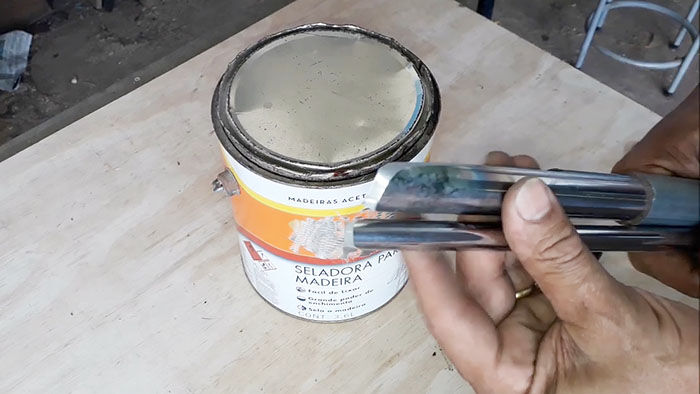 Если жестяная банка имеет крышку, то удаляем ее, поскольку она нам в дальнейшем не пригодится. Снаружи на боковой поверхности в нижней части, ближе к дну, но не впритык с ним, маркером проводим окружность, достаточную для размещения закаливаемых ручных инструментов. Кстати, это отверстие будет выполнять еще одну функцию – через него из окружающей атмосферы будет поступать воздух для поддержания горения.