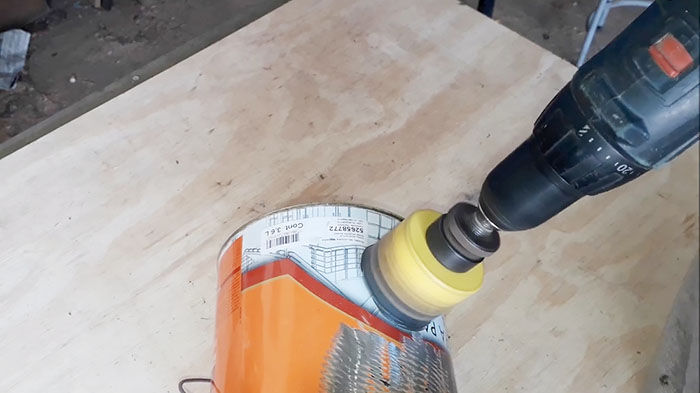 С помощью дрели и корончатого сверла выполняем по разметке отверстие в банке. Если вырезаемый круг не полностью отделился от окружающего металла, удаляем его плоскогубцами.