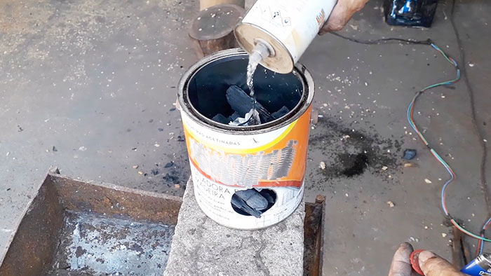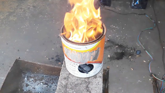 Воспламеняем содержимое банки внешним источником (спичками, зажигалкой и пр.) и ждем пока древесный уголь не прогорит и не исчезнет открытое пламя.