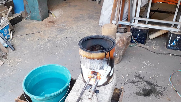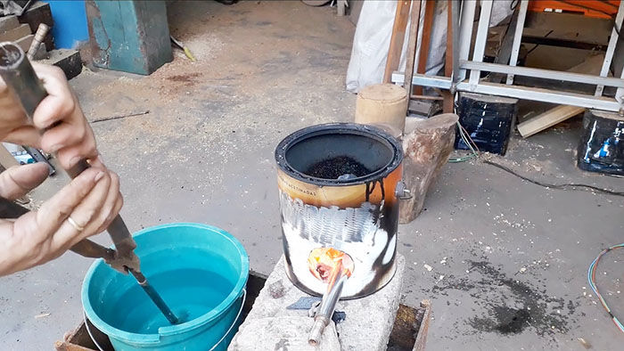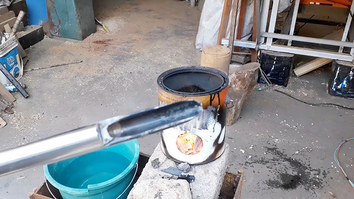 После этого через боковое отверстие в наш импровизированный мини-горн помещаем ручные инструменты, подлежащие закалке, и выдерживаем их там, пока металл не раскалится докрасна.