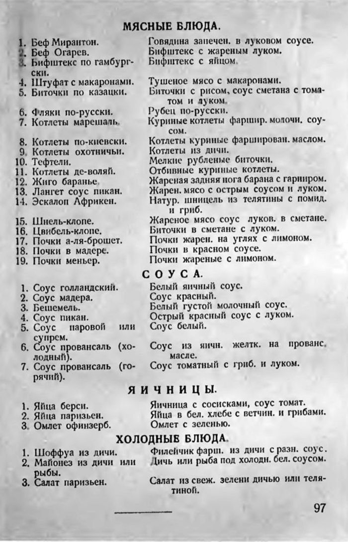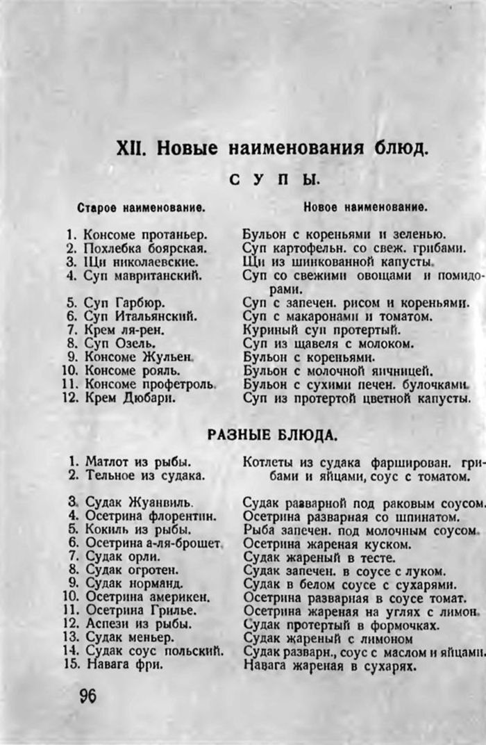 Так, например, привычные нам тефтели стали "мелкими рублеными биточками", пикантный соус – "острым красным соусом с луком", а изысканный "крем ля рен" превратился в "куриный суп протертый". Даже "консоме жюльен" получило новое, более простое имя – "бульон с кореньями". Этот процесс был частью более широкой тенденции по "русификации" и "пролетаризации" культуры и быта в молодом советском государстве.