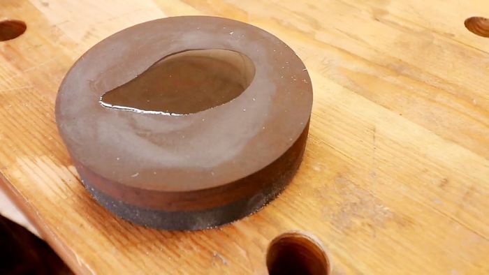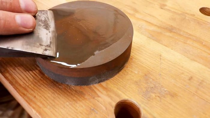 Размер зерна таких заточных брусков предполагается от 300 – 3000. Нам нужен близкий к финишному значению. Наливаем на него пару капель сольвента или керосина, в которых содержится примесь масла, и начинаем растирать его лезвием топора круговыми движениями.